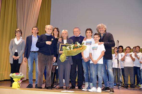 Sabato 15 novembre, presso il teatro dell’Istituto Sacro Cuore (g.c.), si è svolta la cerimonia di consegna della Ruota d’Argento 2014 alla Prof.ssa Giovanna Rondonotti. All’apertura del sipario, la festeggiata ha avuto la gradita sorpresa di vedere schierato sul palco il Kinder Chorus Paolo Perduca da Lei fondato, che, con la magistrale direzione del Maestro Enzo Consogno, ha eseguito alcuni canti gioiosi. In assenza del Sindaco, occupato per l’emergenza maltempo, hanno rivolto il saluto dell’Amministrazione comunale ai numerosi presenti il vicesindaco Marcello Traversa e l’Assessore alla cultura Alessandra Sterpi. Il presidente dell’A.I.C. Pietro Baldi ha letto un breve curriculum della Prof.ssa Rondonotti, e ha consegnato la targa d’argento alla premiata che, visibilmente commossa, ha ringraziato e ha ricordato i lunghi anni dedicati al nostro paese, sia come docente presso la Scuola media sia come promotrice di varie iniziative extrascolastiche.