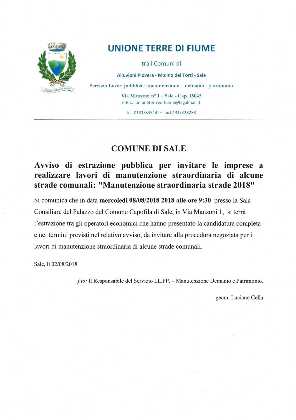 Si comunica che in data mercoledì 08/08/2018 2018 alle ore 9:30 presso la Sala Consiliare del Palazzo del Comune Capofila di Sale, in Via Manzoni 1, si terrà l’estrazione tra gli operatori economici che hanno presentato la candidatura completa e nei termini previsti nel relativo avviso, da invitare alla procedura negoziata per i lavori di manutenzione straordinaria di alcune strade comunali.