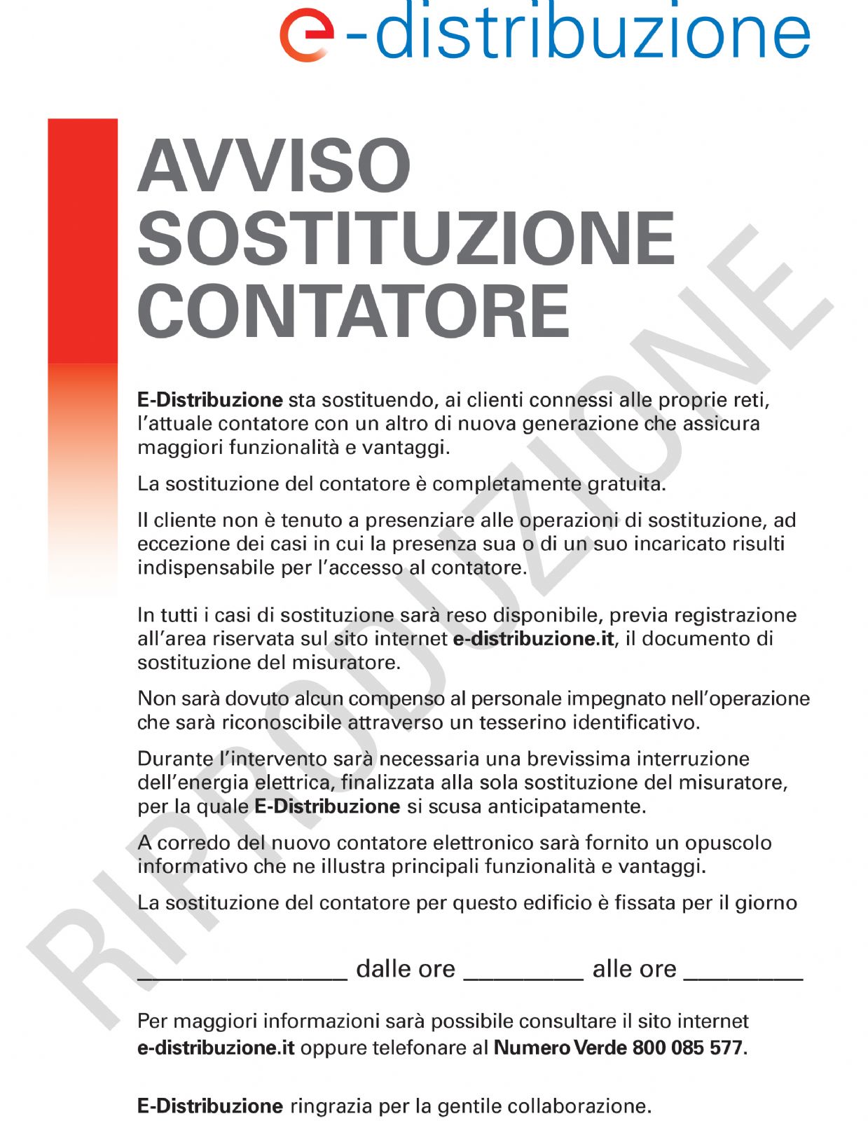 Si comunica che nei mesi di Febbraio e Marzo verranno sostituiti i contatori dell'energia elettrica di tutte le utenze presenti sul nostro territorio. In allegato una riproduzione di un avviso sul quale vengono descritte le modalità di sostituzione.